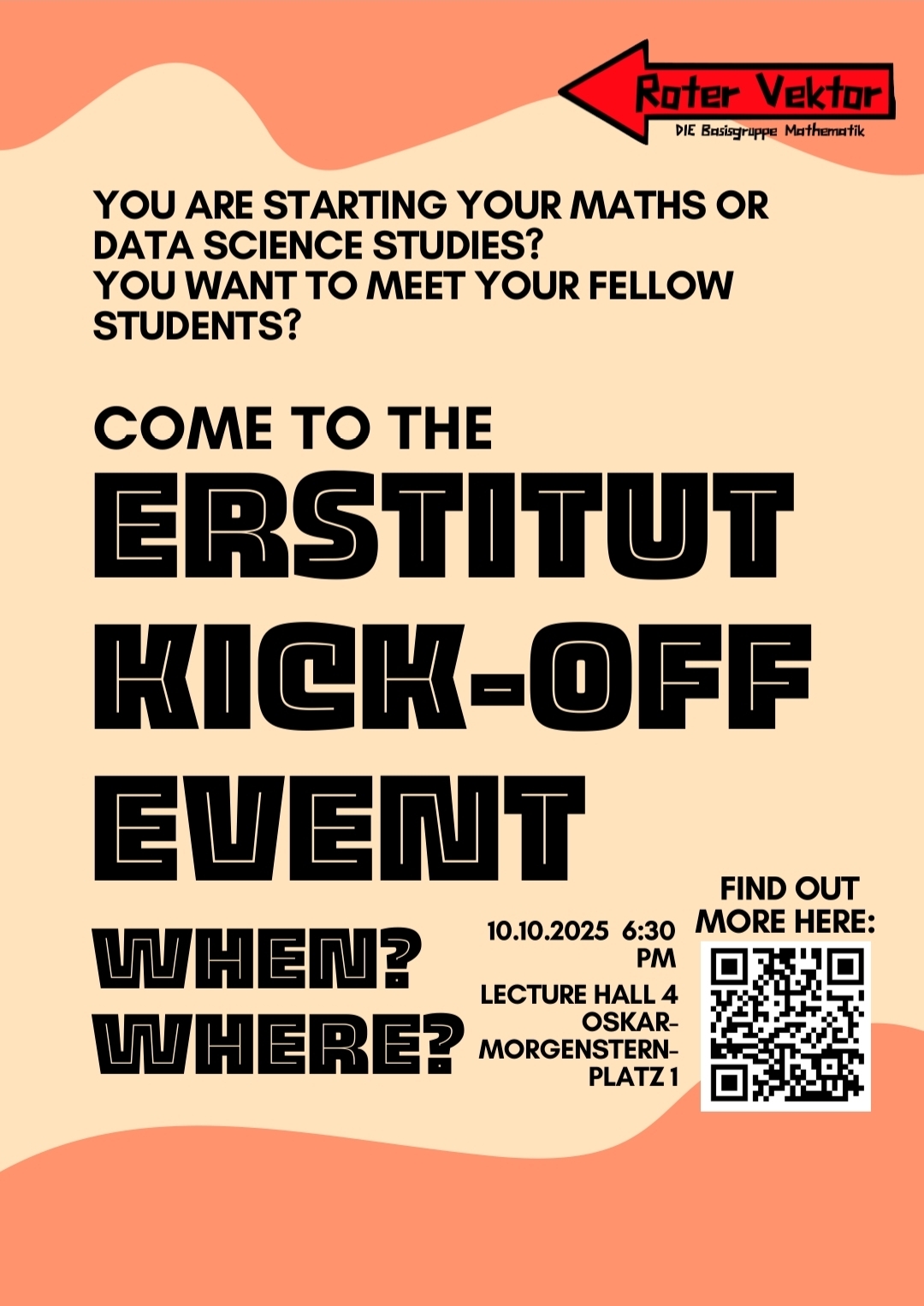Would you like to join us and organize events for your fellow students, as well as help with general organizational matters? Come along to the Plenum. These are weekly meetings of the Roter Vektor Mathematik.